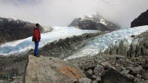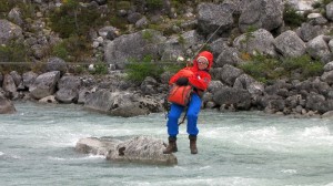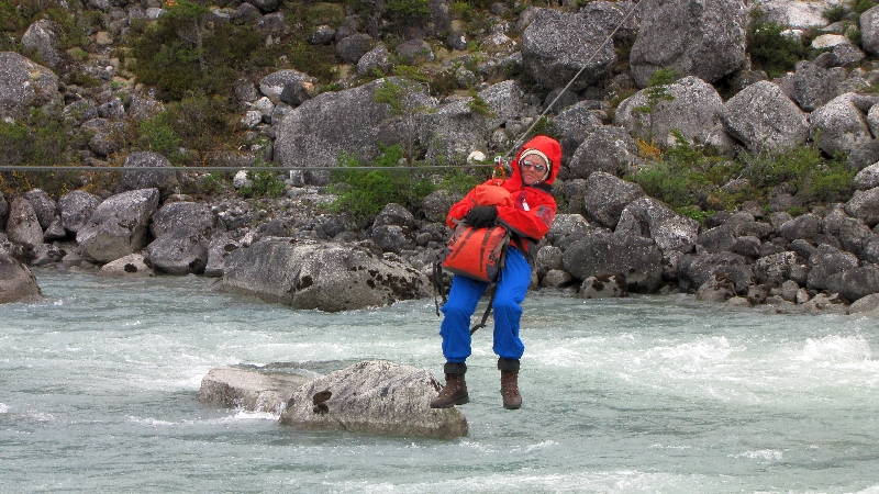 Mit 60 Stundenkilometer rast er mit uns den Rio Leones Fluß hinauf, abgestorbene Bäume, Steine im Fluß schießen nur so an uns vorbei, total verrückt! Dann geht es nicht mehr weiter, zu Fuß geht es eine Stunde zu einem großen Gletschersee. Hier an einem reißenden Strom ist ein Stahlseil gespannt und mit Klettergurten und Seilrollen zischen wir rüber......meine Teilnehmerin Klara meinte: „Michi das habe ich nicht gebucht!“
