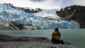 Drüben angekommen zieht Phillipe aus einem Unterstand ein großes Schlauchboot, weiter geht die wilde Fahrt zum 20 km langen Leones Gletscher, der steil und tiefblau mit 30m hohen Eisblöcken in den See kalbt – was für ein Brotzeitplatz!