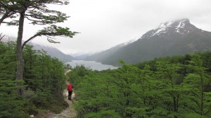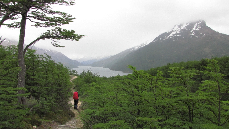 Wir schultern unsere Rucksäcke, das Gepäck soll später mit Pferden nachkommen, und marschieren durch unberührte Südbuchenwälder weiter. Nach 10km erblicken wir von einem Paß den langgezogenen Lago del Desierto, davor die Grenzstation der Argentinier mitten im Wald – die sind total Tiefenentspannt, sitzen in Trainingsanzügen da und wundern sich das wir hier antraben. Ja, hart sei der Job, 1 Monat 24h täglich seien sie da, aber dann Gottseidank hätten sie 3 Monate frei!